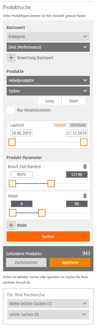 Speichern Sie Ihre Produktauswahl ab, können Sie bei einem späteren Aufruf des Hebelfinders über die Box „Für Ihre Recherche“ unter „Meine letzten Suchen“ darauf zurückgreifen.